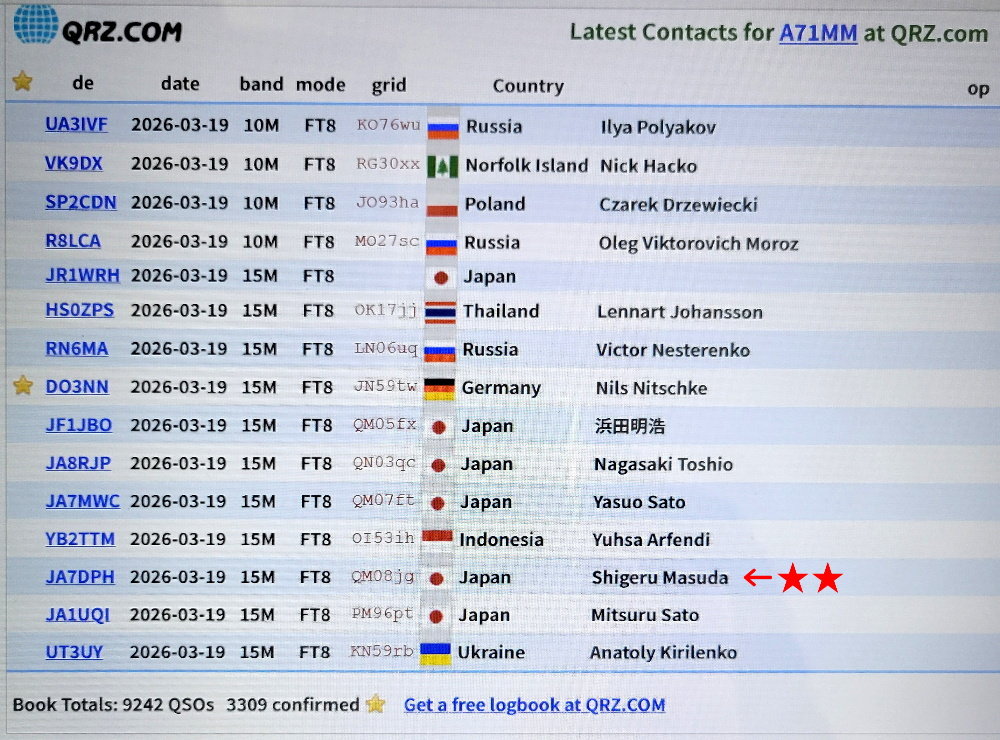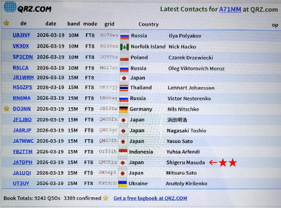 2026年3月19日 UST05:51/JST14:51、周波数:21MHz空中線電力150wでした。モードはFT-8、アンテナはバーチカル(地上高3m)。